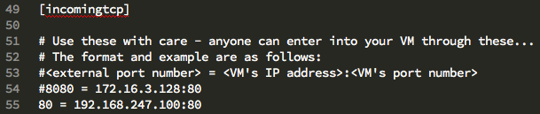 This change gave my VM the permanent ip address of 192.168.247.100. Then by adding line 55 to /Library/Preferences/VMware Fusion/vmnet8/nat.conf I was able to forward localhost on my Mac to IIS on my VM...