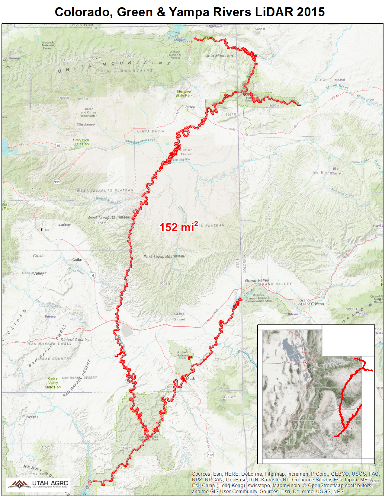 During late Fall of 2015 the Utah Division of Forestry, Fire & State Lands and the U.S. National Park Service acquired ~152 square miles covering ~680 river miles of 8 points per meter LiDAR of the Colorado, Green, and Yampa rivers in Utah and Colorado. The LiDAR collection is mainly of the river course and not the surrounding canyons. A small ~.8 square mile area was also collected in Arches N.P. The .5 meter resolution bare earth DEMs and first-return/highest-hit DSMs in .tif format have a 10.0cm vertical RMSE accuracy and are available for download. The LAS classified point clouds are available from Open Topography. This elevation data was collected October and November of 2015 during low flow conditions.