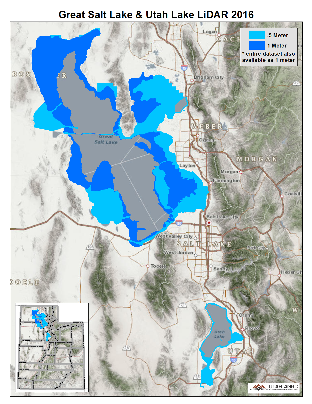 During the Fall of 2016 UGRC, Utah Geological Survey, and the Utah Division of Forestry, Fire and State Lands acquired ~1,555 square miles of 2 and 8 ppm Quality Level 1 and 2 LiDAR of the Great Salt Lake and Utah Lake. The GSL portion of the project, collected between September and November 2016, is a combination of .5 QL1 and 1 meter QL2. Some areas are available as .5 meter although the entire GSL project areas is available as 1 meter. During the acquisition the GSL was at a historical low. The Utah Lake portion, collected between October and November 2016, is all .5 meter and is mainly the lake shoreline. More LiDAR around Utah Lake can be found in the 2013-2014 collection. The .5 and 1 meter resolution bare earth DEMs and first-return/highest-hit DSMs in .img format have a 10.0cm vertical RMSE accuracy and are available for download. The LAS classified point clouds are available from The National Map, Open Topography, or by request from Rick Kelson from UGRC at RKelson@utah.gov. This elevation data has a UTM NAD83 (2011) zone 12 north meter NAVD88(GEOID12) projection.