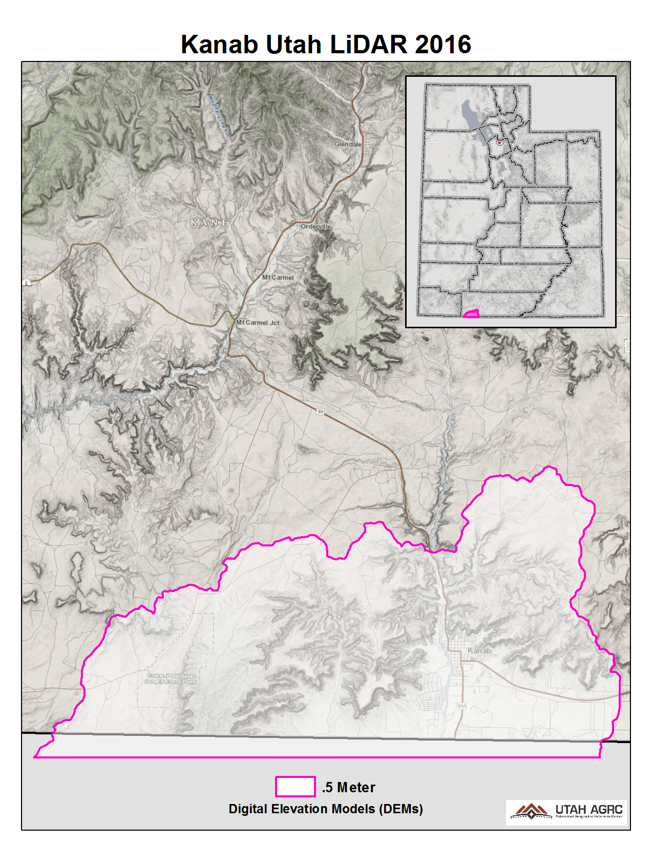 In 2016 the Natural Resource Conservation Service (NRCS) acquired LiDAR around Fredonia, AZ that covers ~150 square miles of Utah with 8 points per meter Quality Level 1 LiDAR and includes Kanab, UT. The .5 meter resolution bare earth DEMs and first-return/highest-hit DSMs in .img format have a 10.0cm vertical RMSE accuracy and are available for download. The LAS point clouds, classified to ground, low, medium, and high vegetation, are available from The National Map or by request from Rick Kelson from UGRC at RKelson@utah.gov. This elevation data was collected between October and December, 2016 and has a UTM NAD83 (2011) zone 12 north meters NAVD88(GEOID12) projection.