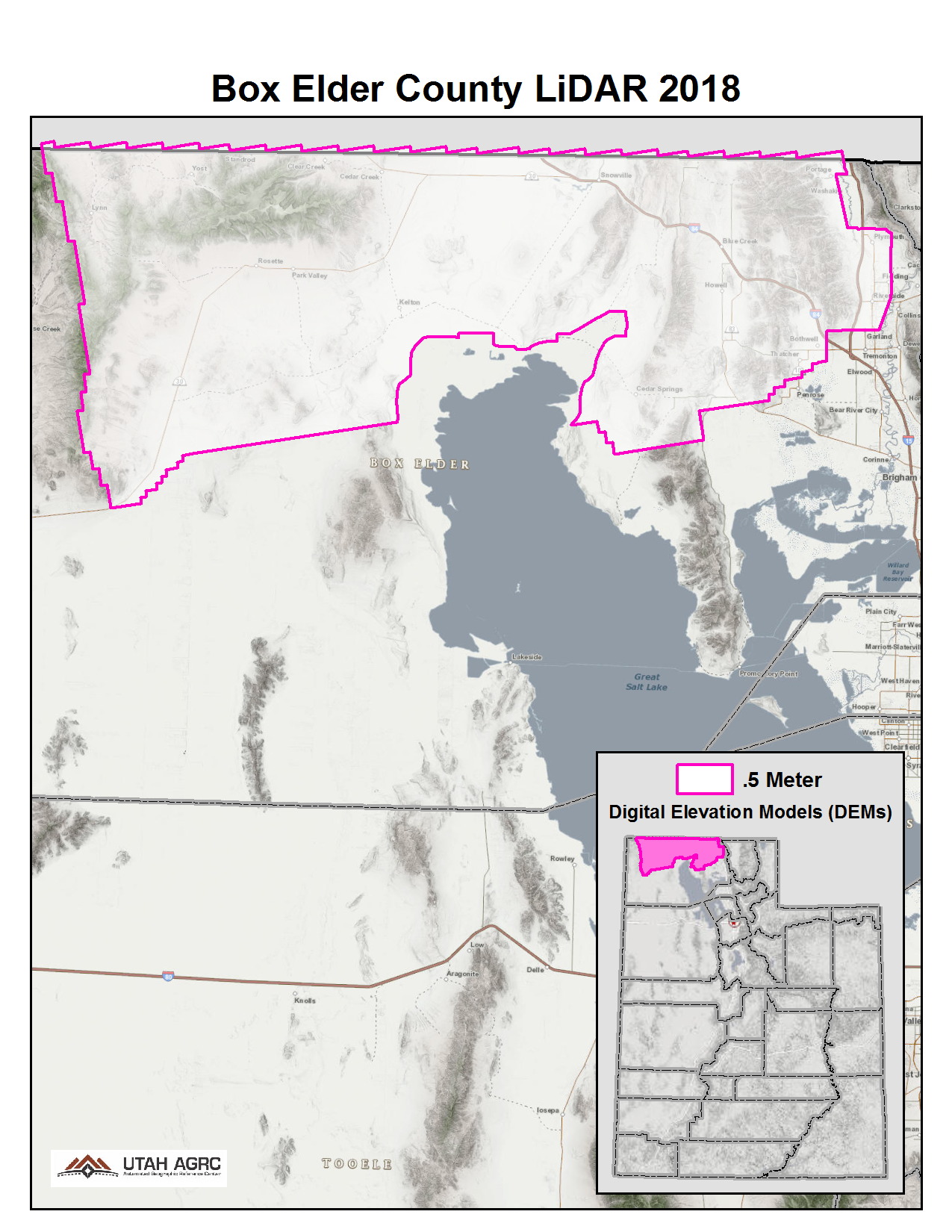 During 2018 UGRC, the Natural Resource Conservation Service (NRCS), and the Utah Geological Survey (UGS) acquired ~2,271 square miles of 2 and 8 points per meter Quality Level 1 & 2 LiDAR for areas in Northern Utah. The .5 and 1 meter resolution bare earth DEMs and first-return/highest-hit DSMs in .tif format have a 10.0cm vertical RMSE accuracy and are available for download. The LAS point clouds, classified to ground, are available from The National Map or by request from Rick Kelson from UGRC at RKelson@utah.gov. This elevation data was collected between April and October, 2018 and has a UTM NAD83 (2011) zone 12 north meters NAVD88(GEOID12) projection.