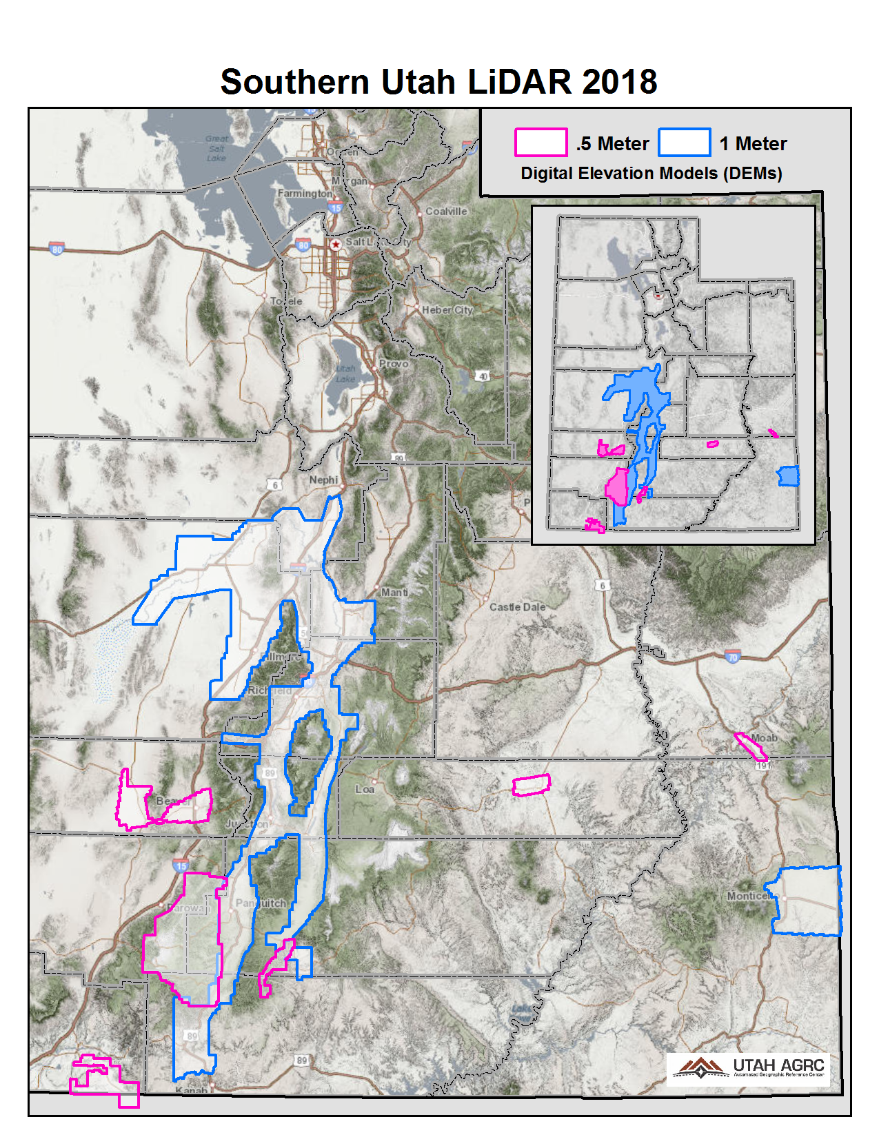 During 2018 UGRC, Utah Division of Emergency Management, US National Park Service, and US Forest Service acquired ~5,466 square miles of 2 and 8 points per meter Quality Level 1 & 2 LiDAR for areas in Southern Utah. The .5 and 1 meter resolution bare earth DEMs and first-return/highest-hit DSMs in .tif format have a 10.0cm vertical RMSE accuracy and are available for download. The LAS point clouds, classified to ground, are available from The National Map or by request from Rick Kelson from UGRC at RKelson@utah.gov. This elevation data was collected between April and October, 2018 and has a UTM NAD83 (2011) zone 12 north meters NAVD88(GEOID12) projection.